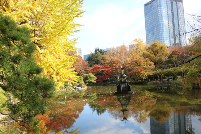 約16万平方メートル の敷地内には、イチョウやハナミズキ、イロハモミジと、黄色や赤色に染まる紅葉樹が多く見ごたえがあります。その中でも特におすすめなのは、雲形池の水面に映る紅葉と、テニスコート横から霞門に抜けるS字形のイチョウ並木。都会の疲れた心を癒してくれます。