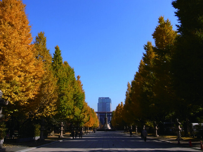 大鳥居から本殿へと続く参道には、約240mにわたり、イチョウ並木と石灯籠が一直線に並び、黄色の絨毯が敷き詰められます。本殿の裏手にある神池庭園の色鮮やかなモミジも見どころです。秋季限定の刺繍入り朱印(初穂料 1,000円)も頒布しています。※数に限りがあります