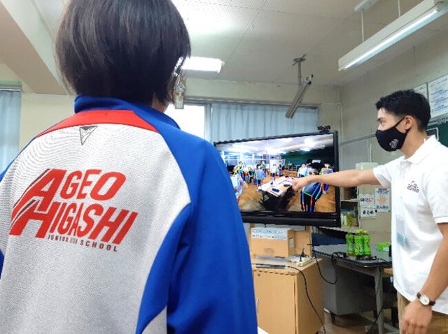 出前授業ではオンラインを通してベトナムのアジラオフィスのエンジニアらと交信。実際にリモートで協力しあい開発する生の声を聴くことで、生徒たちもその状況を体感しました。
