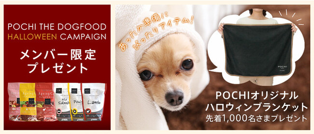 プレミアムドッグフード専門店・通販「ポチの幸せ(POCHI)」(運営:マーケティングパートナー株式会社、本社所在地:東京都新宿区、代表取締役社長:権田真司、Tel:03-6772-8194)は、「POCHI ザ・ドッグフード」の対象商品(POCHIザ・ドッグフード エイジングケアもしくはベーシック、ウェットいずれか)を7,700円(税込)以上ご購入すると、POCHIロゴ入りのオリジナル「ハロウィンブランケット」が付いてくるキャンペーンを2022年10月14日(金)から開始しました(先着1000名さま限定)。