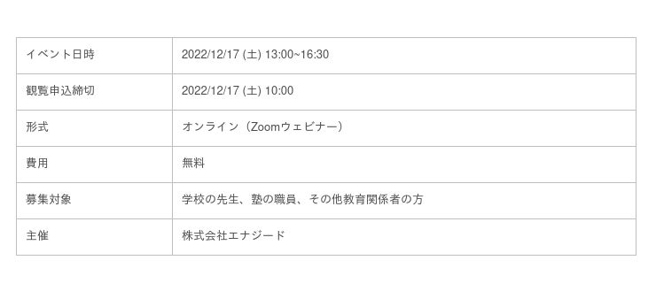また、教育関係者・生徒・保護者の方の一般観覧の募集を開始いたしましたので、ご興味ある教育関係者の皆様は詳細ページを御覧ください。 https://www.enageed.jp/summit-2022-viewing