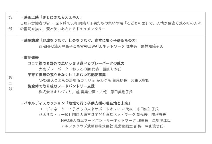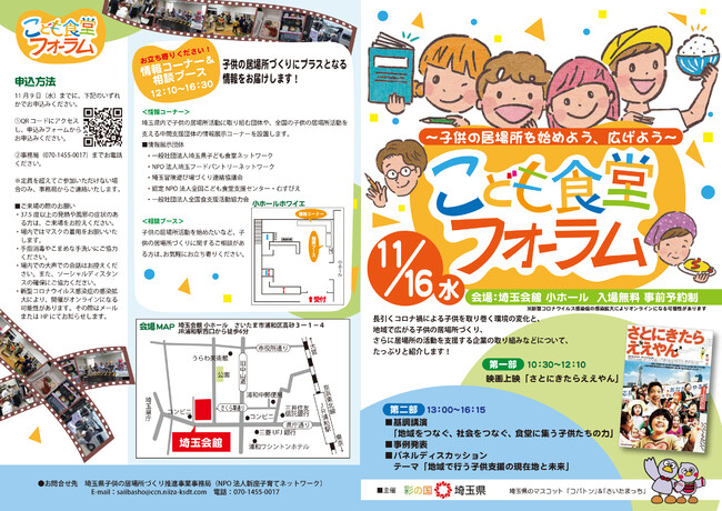 埼玉県では、子供の居場所づくりの機運を更に高めていくため、子供の居場所に関わる様々な人が集う「こども食堂フォーラム」を開催し、長引くコロナ禍による子供を取り巻く環境の変化と、地域で広がる子供の居場所づくり、さらに居場所の活動を支援する企業の取組等について、たっぷりと紹介します。