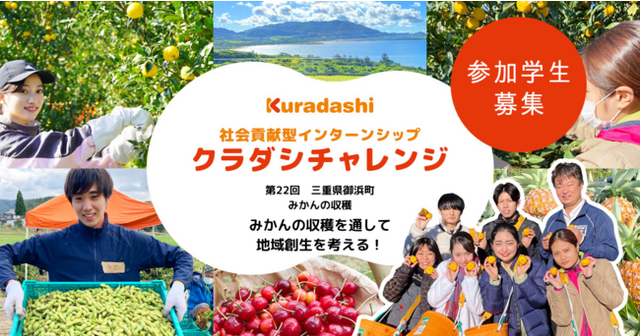 ソーシャルグッドマーケット「Kuradashi」を運営する株式会社クラダシ(本社:東京都品川区、代表取締役社長:関藤竜也、以下「クラダシ」)は、12月に三重県御浜町で開催が決定いたしました、社会貢献型インターンシップ「クラダシチャレンジ」の参加学生の募集を開始いたします。