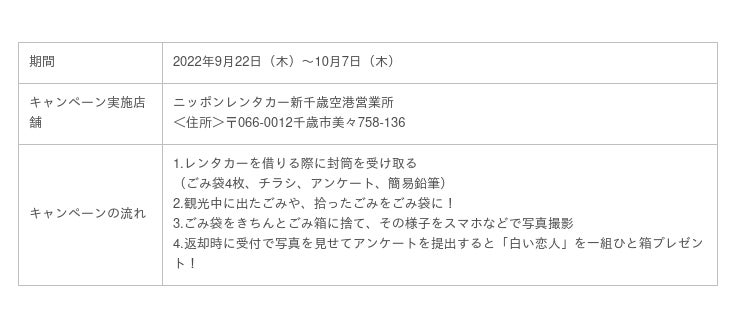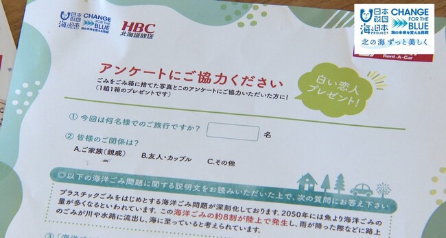 車を借りる際に「CHANGE FOR THE BLUEごみ袋」と「趣旨説明のチラシ」「海洋ごみに関するアンケート」を渡し、旅行中に出たごみは、ごみ箱にきちんと捨てる事とその様子を写真に撮る事を依頼。車の返却時にその写真を受付に見せ、海洋ごみアンケートに答えると、北海道みやげとして長年絶大な人気を誇る「白い恋人」をプレゼントいたしました。