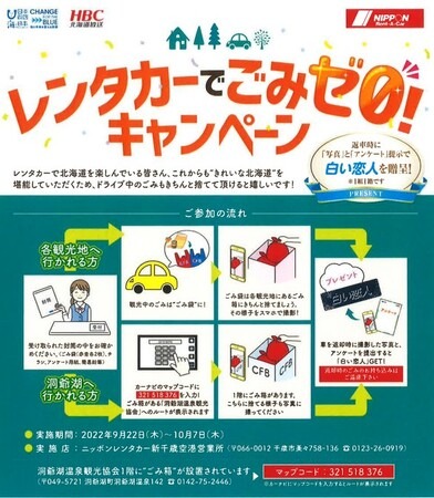 CHANGE FOR THE BLUE in 北海道実行委員会は、9月22日(木)から10月7日(木)の2週間、ニッポンレンタカー北海道と連携し北海道を訪れる観光客に「ごみ拾いと同時にごみのポイ捨てをせず、きちんと捨てることが大切だ」と実感していただくことを目的に「レンタカーでごみゼロキャンペーン」として観光客の海洋ごみ問題への意識向上を図ると同時に、一連の取り組みによって誘客効果があるのかについての実証実験を行いました。2023年度は道内複数の空港で、本企画の拡大版を実施する予定です。