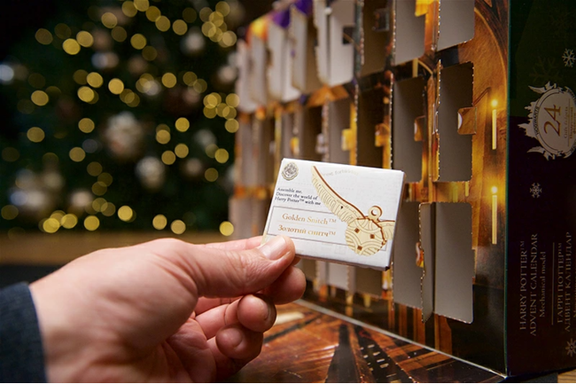 12月1日から毎日ひとつずつ窓を開けていくとホグワーツ魔法魔術学校とその4つの家(グリフィンドール、ハッフルパフ、レイブンクロー、スリザリン)の紋章が入った回転式のバッジなど、ハリー・ポッターを象徴するアイテムができあがります。