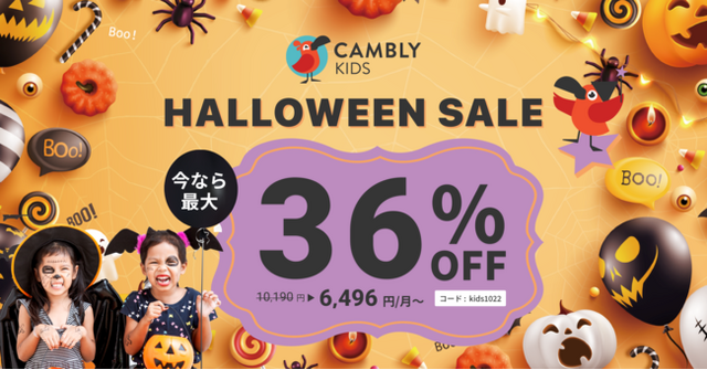 Cambly Inc.(本社:アメリカ・サンフランシスコ、日本代表:佐藤 亜希子)が提供する子ども向けオンライン英会話サービス「Cambly Kids(キャンブリー キッズ)」は、10月24日(月)から10月28日(金)までの5日間、Cambly Kids全レッスンプランを最大36%OFFでご利用いただけるハロウィンセールを開催いたします。