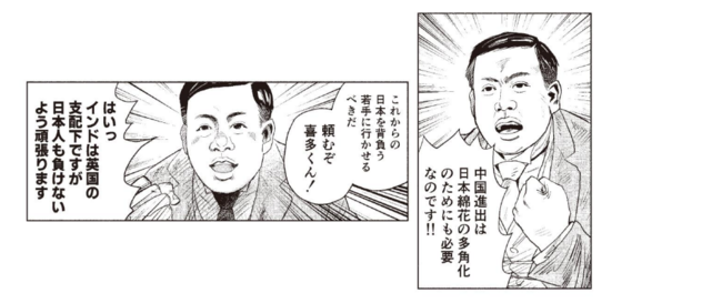 一方の日本綿花初代社長の佐野常樹は、海外綿花の調達を試みるが、輸送を外国船籍に依存しなければならない現状に苛立ち、渋沢栄一や他の紡績会社に働きかけ、日本郵船による日印定期航路を開通させる。