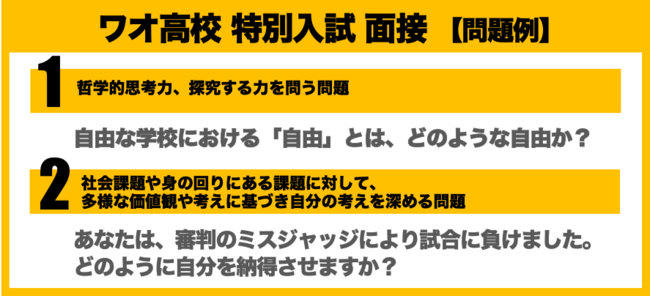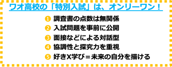 ワオ高校は、子供たちの協調性や探究力、そして、「心」を重視しない高校入試のあり方そのものに改革を起こすべく、総合選抜型で唯一無二の「特別入試」を11月に実施しますので、お知らせします。