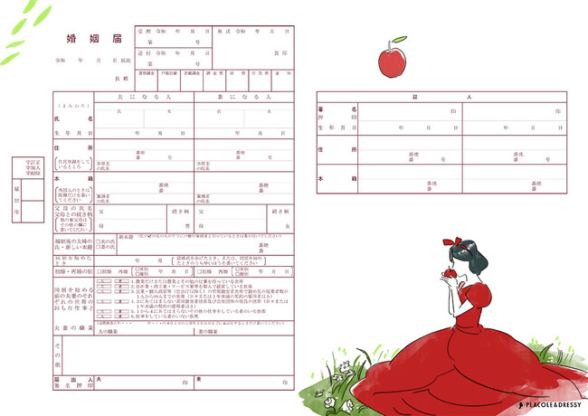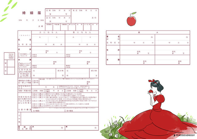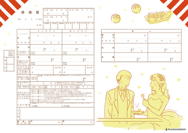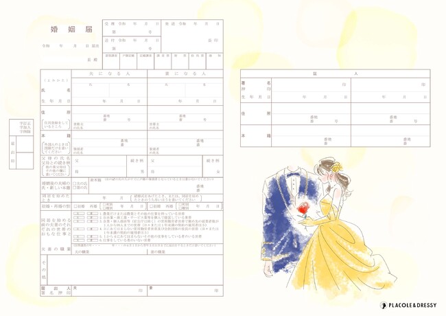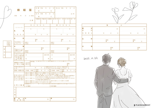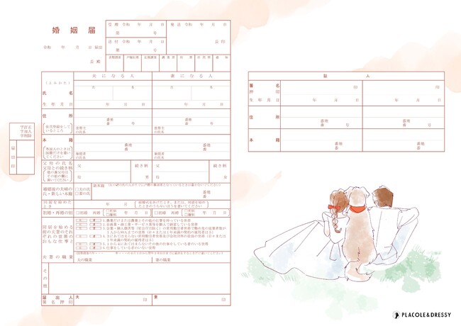 この度、多くの方からお声をいただき、『PLACOLE & DRESSY婚姻届』第14段では人気のプリンセスデザインと共に、11月1日(ワンワンワンの日)にちなんだ犬モチーフの婚姻届や11月22日(いい夫婦の日)の新デザインも発表。9月よりリリースした地域限定デザインの大阪、愛知ver.も登場、オリジナル婚姻届を描き下ろしでお届けいたします。