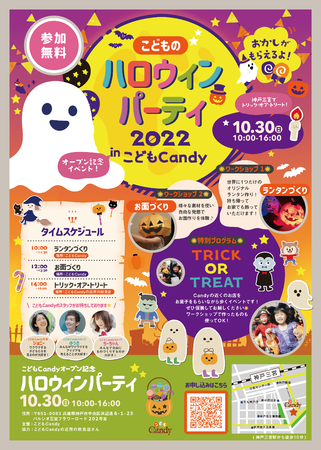プレオープンイベントとして2022年10月30日(日)にこどもハロウィンパーティを開催します。イベントでは、ランタン作りやお面作り、近くの飲食店を歩きながらお菓子をもらうトリック・オア・トリートのイベントを開催します。