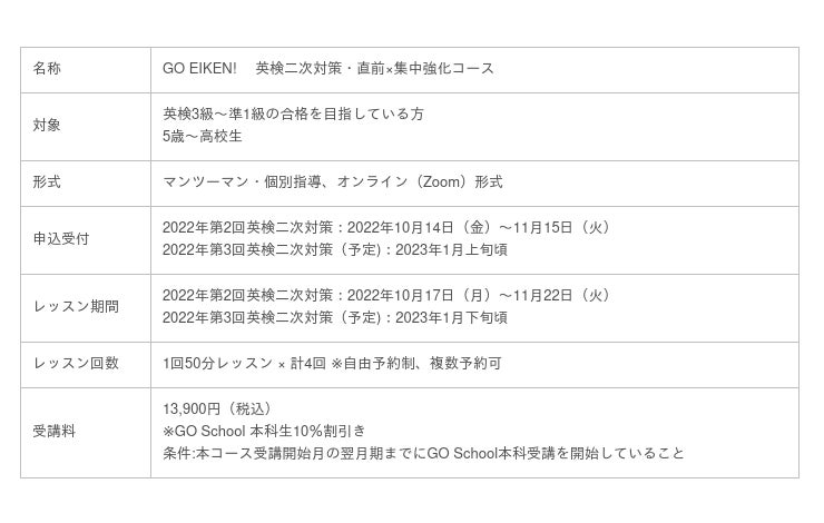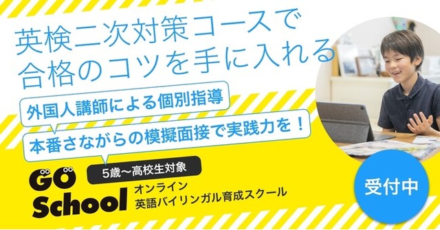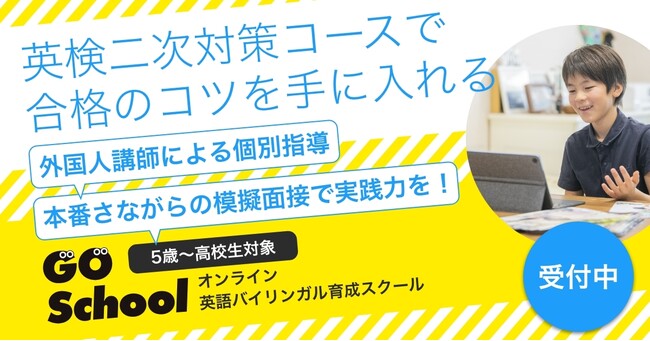 一次試験に無事合格したのに、二次試験対策を十分にせず、本番に臨むのはもったいないことです。傾向と対策をしっかり知った上で、自信を持って本番に臨むことは、英語学習の更なるモチベーションアップに繋がるとGO Schoolでは考えています。