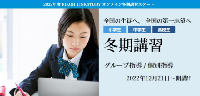 株式会社増進会ホールディングス(Z会グループ)のグループ会社、株式会社栄光(本社:東京都千代田区 代表取締役社長:下田勝昭)が運営するオンライン進学塾「EIKOH LiNKSTUDY(栄光リンクスタディ)」は、2022年12月21日(水)~2023年1月7日(土)の期間、小学1年生~高校3年生対象の冬期講習を開講します。グループ指導・個別指導で、学習目的に合わせた1講座4回の授業を受講できます。