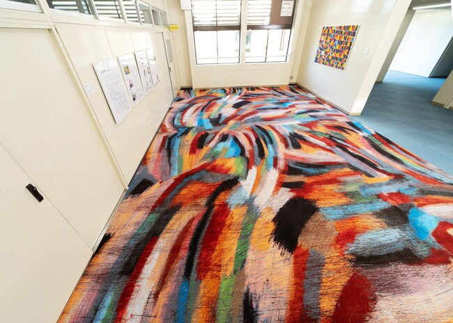 この企業と学校の連携は、ヘラルボニーが展開する自社ブランドのプロダクトに長谷虎紡績のカーペットが採用されたことに始まります。ヘラルボニー社員の安藤奈穂氏(広報担当)と長谷虎紡績の長谷享治氏(代表)のお二人が、共に麗澤瑞浪中学・高等学校の卒業生であったことをきっかけに、母校の生徒たちに何か役立つことはできないかと考えるに至りました。そして、2022年3月より、企業2社1校協働プロジェクトで検討をはじめました。「社会で求められている『Diversity & Inclusion』とは」「福祉と学校という分野について、学校教育の現場ではどのように考え、何に取り組むべきか」検討を重ねた結果、8月に第1弾として麗澤瑞浪の校舎内にアートパネル・カーペットの設置が実現し、起用された6名の作家の紹介や、コンセプトである「あなたは、あなたのままで、すばらしい!」を広く全校生徒へ伝える取り組みが始まりました。