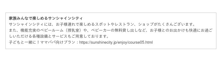 サンシャインシティが、ファミリーにとってよりいっそう“楽しく” “居心地よく” “安心して”過ごせる場所になるために、様々な取り組みを行うプロジェクトです。