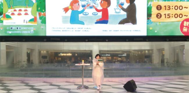 絵本のプロたちによる絵本作品の読み聞かせ会を開催。噴水広場の大型ビジョンに映し出された絵本を見上げながら、プロの読み聞かせを楽しむことができます。