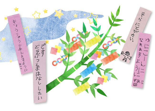 「絵本の森」の七夕イベントで集まった短冊の中から、題材にする短冊を選びオリジナルストーリーをつくりました。ストーリーは絵本のひろばの大画面のテレビ絵本に放映されます。どの短冊が選ばれたのか、お楽しみに!