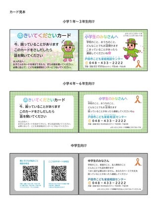 埼玉県戸田市では、子どもが悩みを相談しやすくなることを目的に、市内の全小中学校に通う子どもを対象に「きいてくださいカード」を配布します。カードのデザインは、小学1~3年生、小学4~6年生、中学生用の3種類あります。