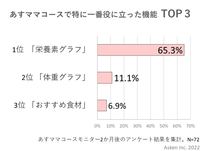 利用開始2か月後のモニターアンケートで、「あすママコース」で一番役に立った機能について質問したところ、1位は栄養素の過不足がわかる「栄養素グラフ」、2位は週数、体格に合わせた目安体重がわかる「体重グラフ」、3位は不足しがちな栄養素を補える食材の提案「おすすめ食材」でした。
