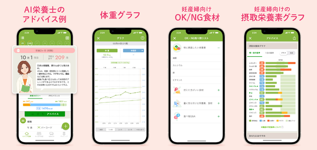 『あすけん』は食事画像やバーコードを読み取るだけでカロリーや栄養素が表示され、ご自身に合った目標摂取エネルギーや各種栄養素に対する過不足が一目でわかる食事管理アプリです。「あすママコース」は、プレミアムサービス*²会員が選択できるコースのうちの一つで、妊娠中・授乳中の方が体重や食事の記録を一度に行うことができます。また、特に意識したい栄養素をバランスよく摂るためのコツなど、食生活に役立つアドバイスをAIによって自動で提供しています。