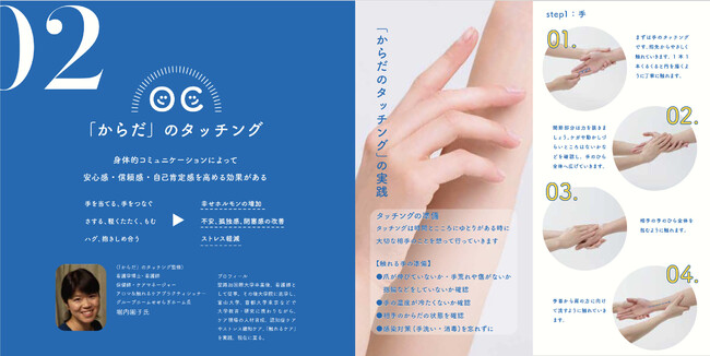 触れ合いには、手をつなぐ・さする・抱きしめ合うといった「からだ」の触れ合いと、目と目を合わせる・優しく接する・感謝を伝えるといった「こころ」の触れ合いがあります。本プロジェクトではこの2つの触れ合いの大切さを伝えるとともに、効果的に幸せホルモン「オキシトシン」を分泌させるためのタッチングノウハウを専門家の監修のもと開発し、特設サイトや「エッセンシャルタッチブック」を通して発信しています。