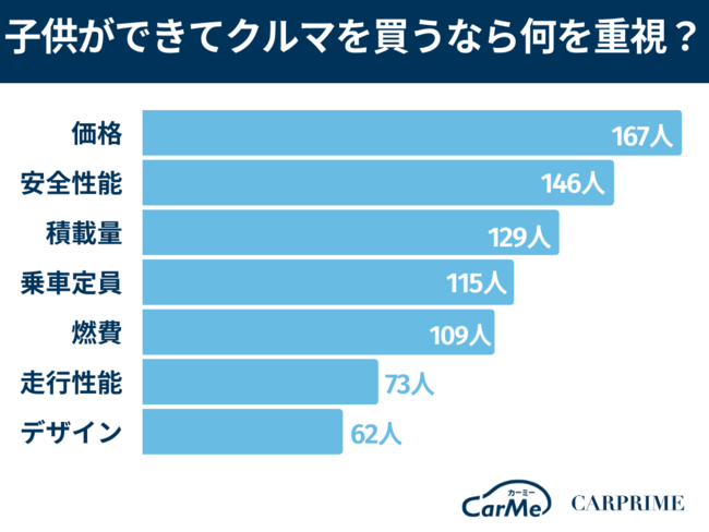 子供ができてクルマを選ぶ時に重視することは、価格が167名(55.7%)で最多となりました。子育てにはクルマ以外にも様々な場面でお金がかかるため、クルマの購入費用は抑えておきたいものです。