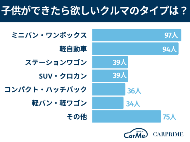 本調査を通じて、子供がいたらクルマが必要だと思う方が多いこと、欲しいクルマのボディタイプとしてはミニバン・ワンボックスと軽自動車が圧倒的人気を誇ることが明らかになりました。
