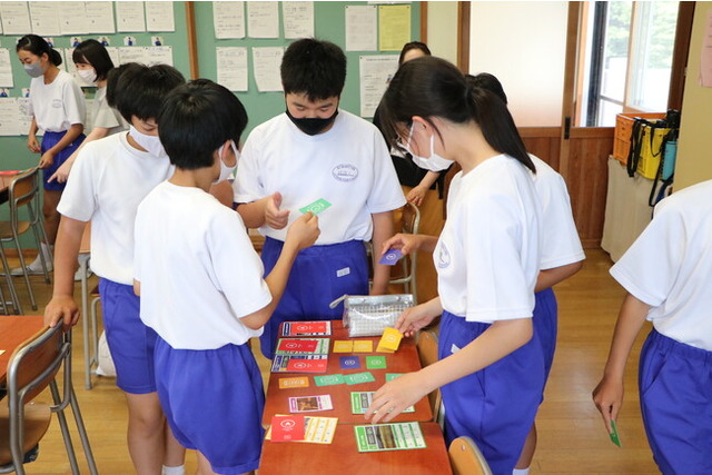 3年生は、昨年度の学習会で学んだ基礎を踏まえ、SDGsの目標達成をテーマとするカードゲーム「2030 SDGs(ニイゼロサンゼロ エスディージーズ)」を体験します。ゲーム内の多様なプロジェクト達成に向けた行動が、社会や環境、経済に与える影響をパルシステム職員のファシリテートで体感します。