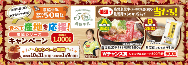 「農協シリーズ」は、当社で販売している農協牛乳をはじめ、農協ヨーグルトや農協珈琲など、「素材」のこだわり・「製法・技術」のこだわり・「生産者・JAとのつながり」のこだわりをもった商品です。本キャンペーンでは、農協シリーズの対象製品対象商品2点分のバーコード、またはレシートをお集め頂き、ご応募いただいた方の中から抽選で合計1,000名様に鹿児島県産黒牛(すき焼き用)500gや魚沼産コシヒカリ5kgなどの豪華賞品をプレゼントいたします。皆様のご応募をお待ちしております。