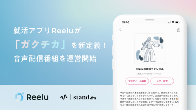 株式会社Reelu(読み:リール、本社:東京都港区、代表取締役:今野珠優、以下Reelu)は、学生や企業の人事担当者をゲストに迎える音声配信番組「Reeluの就活チャンネル」をstand.fm内にて開設し、2022年10月20日より運営を開始することを発表いたします。第1回目のテーマは「ガクチカってなんだっけ?」です。令和時代の学生が”本当の意味で”学生時代力を入れたことは何なのか?本来十人十色であるはずの「ガクチカ」をReelu社独自の目線でユニークに深堀りします。