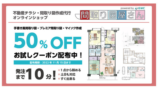 不動産物件資料の作成代行をオンラインで展開するグッドモーニングコミュニケーション株式会社(※以下GMC、大阪本社:大阪市中央区、代表取締役:薦田敏博)は、展開する間取り図作成のなかでデザイン性の高い「手書き風」「プレミア」の2タイプが既存取引先に好評で受注好調なことから、販促拡大すべく、自社ECサイト型受発注システム「間取り図屋さん」へシリーズ展開し販売を開始しました。さらに11/15まで“お試しキャンペーン”として50%OFFのクーポンを配布しております。