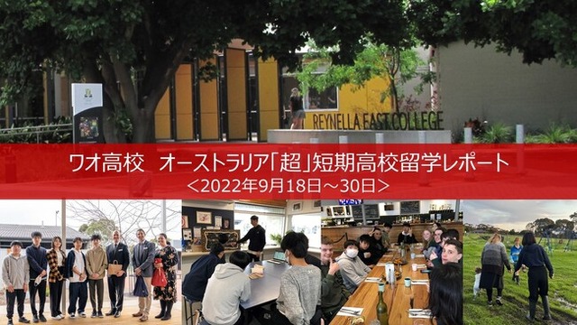 激動の時代を生き抜く力を、実学と教養によって育む、学校法人ワオ未来学園ワオ高等学校(本校所在地岡山県岡山市 校長山本潮)(以下ワオ高校)は、2021年4月開校。好きな時間に好きな場所で学ぶことができる完全オンラインの学校として、未来型の学びを提供しています。このたび、ワオ高校の提携先である、南オーストラリア州の州立高校Reynella East Collegeにて、「超」短期高校留学プログラムを、9 月18 日~30 日に実施しましたので、ご報告いたします。