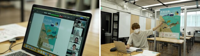 デザインを担当する御茶の水美術専門学校生と20名の小学生は、2人1組のペアとなり、約1ヶ月の間2度のオンライン制作面談を実施。インフォグラフィックのイメージの共有やチェックを行いながら、作品作りを進めました。共同制作期間の中で、この作品をもって何を1番に伝えたいのか何度も相談しながら、自由研究の良さを活かした作品を一緒に作り上げました。