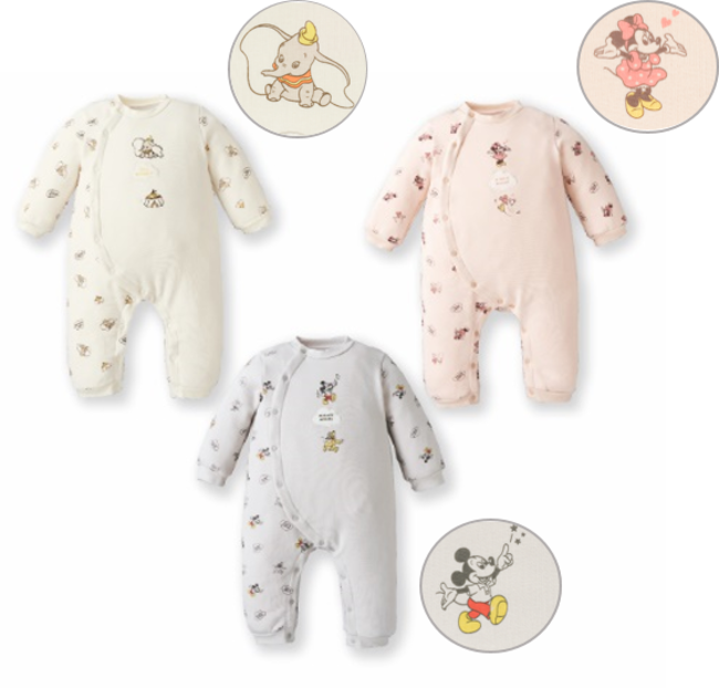 綿100%で保温性がある、あったか素材のドレスオール。かわいいキャラクターを豊富にご用意しました。