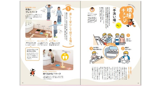 新型コロナの影響で頻度が増えている手洗い。発達に課題のある子のなかには「並んで待てない」「水や蛇口が苦手」「水や石けんの適量がわからない」など、手洗いが苦手な子が少なくありません。今号では、苦手に配慮した「手洗い場」の環境設定アイデアをご紹介。順番待ちの「あと何人?」がひと目でわかるイラスト入りマークなど、コピーやダウンロードして使える素材つき!