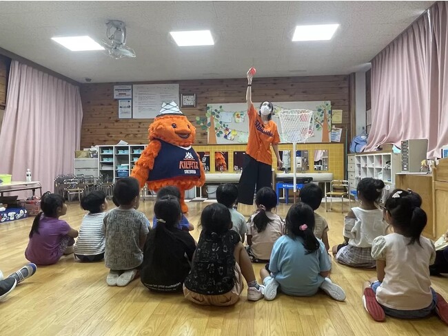 ベルティと指導員が持ち込む簡易バスケットゴールを使い、遊戯室または園庭などで実施します。見よう見まねでのファーストチャレンジの後、「ボールをコントロールして投げ入れる」動きと「ボールを遠くに投げる」動きの違いを中心に指導し、最後にセカンドチャレンジで上達を体験します。