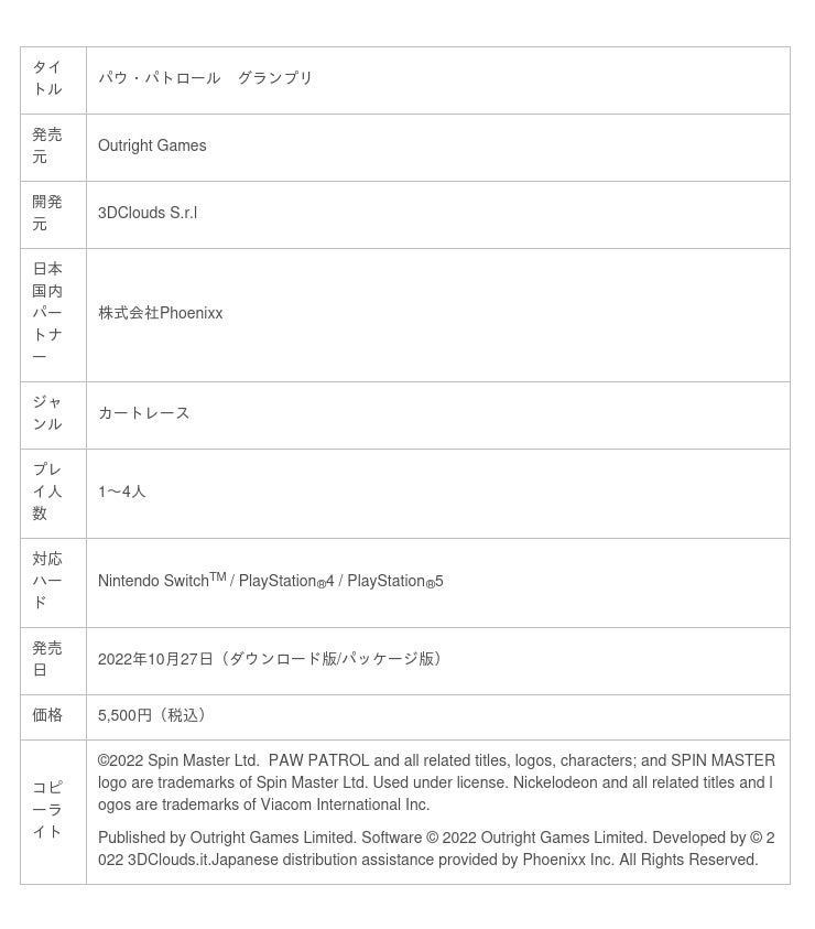 株式会社Phoenixx(フィーニックス)(東京都武蔵野市、代表取締役社長:坂本 和則)は、世界中の子供たちに大人気のアニメ作品「パウ・パトロール」のゲーム、『パウ・パトロール グランプリ』をNintendo SwitchTM / PlayStation(R)️4 / PlayStation(R)️5向けに本日10月27日より配信したことをお知らせいたします。また、Nintendo SwitchTM向けには、パッケージ版も発売しております。