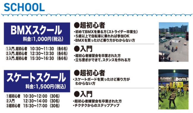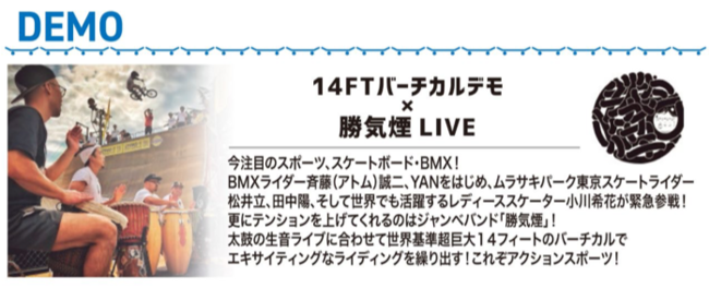 スケートボード、BMXのプロライダー達よるライディング・パフォーマンスをはじめ、スクールや参加無料の体験会など、子供から大人まで楽しめるイベントが盛り沢山となります。アクションスポーツ未経験の方もお気軽にチャレンジできる超初心者クラスからご用意しているスポーツ教室やテックボールの大会、体験会をご用意しています。