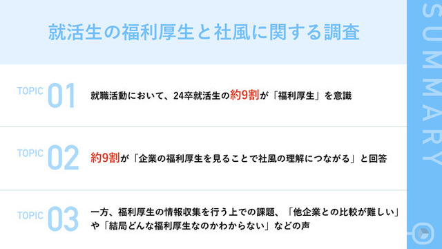 就職活動において、「事業内容」や「企業理念」で社風を参考にする他、企業の福利厚生を見ることでも社風の理解につながると考えられていることから、24卒就活生の約9割が「福利厚生」を意識することが判明しました。