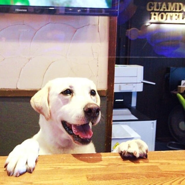 1位は、神奈川県「箱根強羅グアムドッグ本店」のラブラドールレトリバー「デデド」です。オーナーが好きな、米国グアムで人気のデデドの朝市が名前の由来となっています。「箱根強羅グアムドッグ本店」に来る前は、麻薬探知犬の訓練を受けていた経歴がある看板犬です。普段はフロントの下に寝そべって過ごし、宿泊客が訪れると写真のように可愛らしい笑顔を覗かせてお出迎えをしてくれます。投票者からは、「麻薬探知犬だった優秀なワンちゃんが、フロント犬になって甘えてる様子を見に行ってみたいと思いました。」「実際にごろんと寝てる姿を見ました!呼ばれてビクッと起き上がって挨拶に来たのが可愛い。」という声が寄せられています。