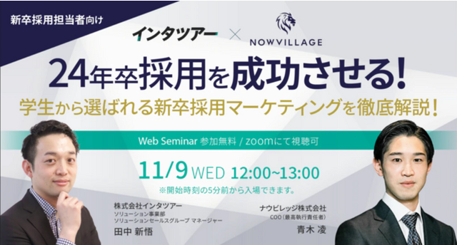 新卒採用向けのリーレション採用プラットフォームを提供する(株)インタツアー(代表:作馬 誠大、本社:東京都港区浜松町)は、2022年11月9日(水)に、新卒採用担当者向けオンラインセミナー『24年卒採用を成功させる!学生から選ばれる新卒採用マーケティングを徹底解説!』を開催いたします。