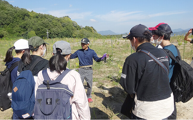 次に,グランピング施設やシトラスパーク園内を見学して,現在公園や地域が抱えている課題についての説明も聞きました。学生たちは美しい景色に感動しつつ,難しい地域課題について,たくさんのことを学んでいました。