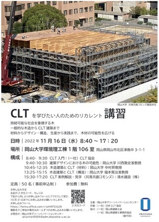 国立大学法人岡山大学(本部:岡山市北区、学長:槇野博史)のグリーンイノベーションセンターでは、2022年11月16日(水)に「CLTを学びたい人のためのリカレント講習」を岡山大学津島キャンパス(岡山市北区)にて開催します。