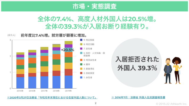 私達はこれまでマイノリティと呼ばれてきた全人口の2%である在留外国人たちに寄り添い、彼らの入居拒否問題を解決すべく累計2,500人以上のお問い合わせを受けて賃貸仲介業を営んできました。多くの大手管理会社や保証会社さまのサポートを通じ、審査要件や日本語能力など40以上の条件分析を元に精度の高いマッチングも可能になってきました。また、日本人口の減少や多くのオーナー様の世代交代を通じて、優秀な外国籍の方たちの受け入れが大きく改善し、彼らに日本に住んでもらう事は日本の国家戦略となっています。