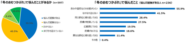 その結果、冬のおむつかぶれに困っている人が約4割(39.5%)もいることが明らかに。中でも「赤みや湿疹などの状態がひどい」、「なかなか治らない」、「皮膚が乾燥している」などで困っているママ&パパが見受けられました。