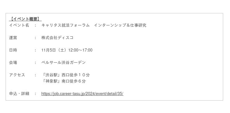 本イベントは、2024年卒業・修了予定新卒者の就活生向けの就活イベントで、人事担当者と対面でリアルな情報が聞ける他、就活準備の基礎~応用まで全てを網羅する形となっており、一層企業理解を深める機会となります。