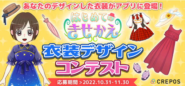 株式会社アイフリークモバイル(所在地:東京都新宿区、代表取締役社長:上原 彩美、以下 当社)は、当社グループ会社である株式会社アイフリークスマイルズが、クリエイターの「作る」を応援するプラットフォーム「CREPOS(クリポス)」上において、未就学児~小学生向けきせかえアプリ「はじめてのきせかえ」に登場する衣装のデザイン買い取りコンテストを、2022年10月31日(月)から同年11月30日(水)まで開催することをお知らせいたします。