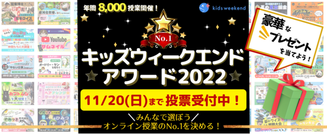 子ども向け「教育×オンライン」の分野では、日本最大級のプラットフォームである「キッズウィークエンド」(運営会社:キッズウィークエンド株式会社、本社:東京都中央区、代表取締役:三浦里江)は、2022年1月~9月にライブ配信した約8,000のオンライン授業の中から選出した「キッズウィークエンドアワード2022」受賞授業を11月1日(火)に発表しました。今年で3回目の開催となる本アワードでは、「先生賞(10名)」「企業・施設・団体賞(10社)」の2部門を設定しています。
