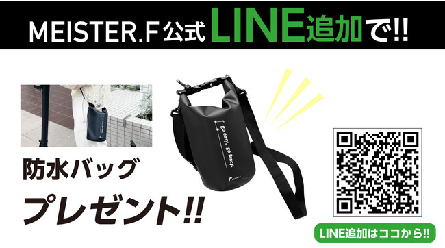 試乗後のアンケートに回答して頂いたお客様にはMEISTER.Fオリジナルグッズのプレゼントの他、MEISTER.F公式LINEのお友達追加で防水バッグもプレゼントいたします。