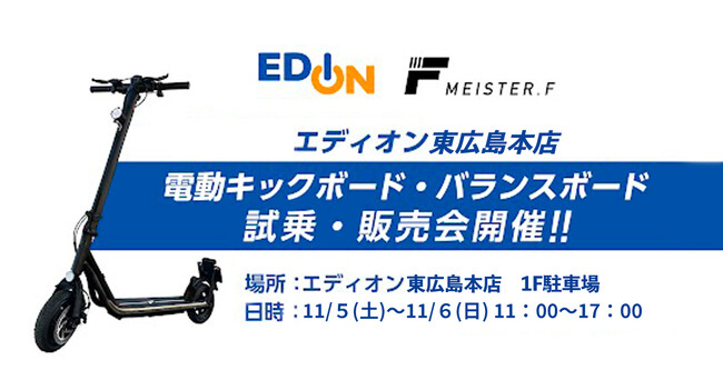 エディオン東広島本店「1F駐車場」にて実施し、 11月5日(土)と6日(日)の2日間ともに、開催時間は昼11:00から夕方17:00までとなります。また、試乗後のアンケート にお答えいただいたお客様には、MEISTER.Fオリジナルのエコバッグやフリクションペンのプレゼントを行います。